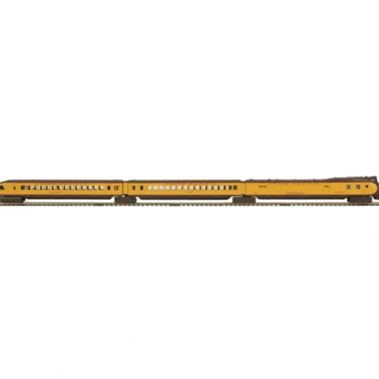 This is an MTH 20-2925-1 Union Pacific M10000 Diesel Passenger Set with Proto Sound 2.0. Features Include: Two-Motored Diesel Locomotive, 3-Car Passenger Consist, Directionally Controlled Headlights, Intricately Detailed ABS Bodies, Metal Wheels and Axles, Die-Cast Truck Sides, Authentic Deco Scheme, Chrome Plated Bodies, Operates On O-72 Track, Metal Chassis, Metal Handrails and Decorative Horn, (2) Precision Flywheel Equipped Motors, All Metal Wheels and Gears, Lighted Marker Lights, (2) Engineer Cab Figures, 12 Passenger Figures In Each Car, Operating Smoke Unit, Locomotive Speed Control In Scale MPH Increments, Proto-Sound 2.0 w/Passenger Station Proto-Effects, Complete Set Measures: 62 3/8 x 2 3/8 x 3 5/8.
