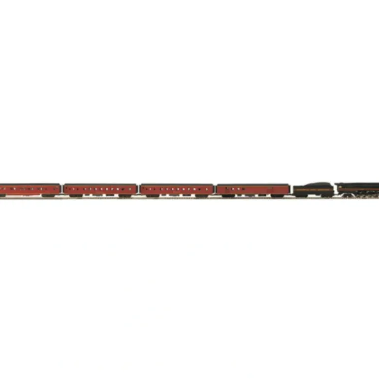 Here is a MTH 20-3365-1 Norfolk & Western N&W J Passenger Set w/Proto-Sound 2.0. Product Features Set Features : Die-Cast 4-8-4 Northern Steam Locomotive 4-Car Passenger Car Consist Locomotive Features : Die-Cast Boiler and Tender Body Die-Cast Metal Chassis Authentic Paint Scheme Metal Wheels and Axles Constant Voltage Headlight Die-Cast Truck Sides Precision Flywheel Equipped Motor Remote Controlled Proto-Coupler Engineer and Fireman Figures Operating Firebox Glow Metal Handrails and Decorative Bell Decorative Metal Whistle Operating Marker Lights Lighted Cab Interior Synchronized Puffing ProtoSmoke System Operating Tender Back-up Light Locomotive Speed Control in Scale MPH Increments 1:48 Scale Proportions Proto-Scale 3-2 3-Rail/2-Rail Conversion Capable Wireless Drawbar Proto-Sound 2.0 With The Digital Command System Featuring: Passenger Station Proto-Effects Operates on O-54 Unit Measures:27 3/4″ x 2 3/4″ x 3 7/8″ Passenger Car Features : Intricately Detailed Durable ABS Bodies Die-Cast 4-Wheel Trucks Operating Die-Cast Metal Couplers Separate Metal Handrails Fast-Angle Wheel Sets Needle-Point Axles Opening Car Doors Detailed Interiors 10 Passenger Figures In Each Car Overhead Interior Lighting