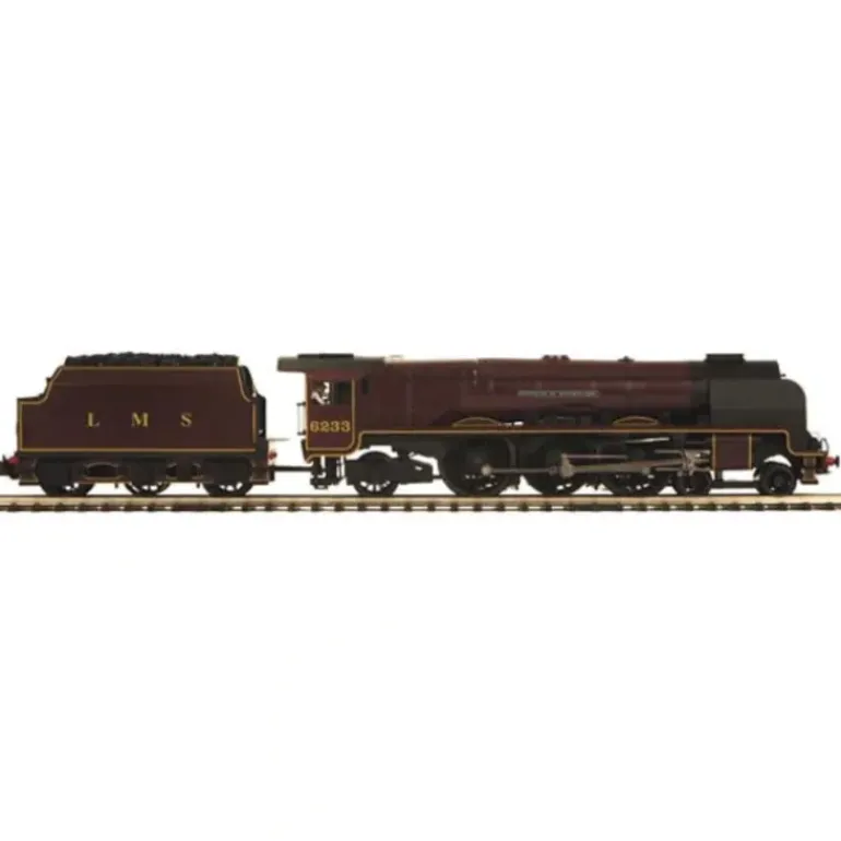 Here is an MTH 20-3368-1 London, Midland and Scottish Railway Princess Coronation Steam Engine w/Proto-Sound 2.0 (Hi-Rail Wheels). This locomotive features a die-cast tender and boiler, die-cast metal chassis, authentic paint scheme, metal wheels and axles, constant voltage headlight, die-cast trucksides, real coal load, precision flywheel equipped motor, remote controlled ProtoCoupler, engineer and fireman figures, operating firebox glow, metal handrails, a decorative bell, decorative metal whistle, operating marker lights, lighted cab interior, operating tender back up light, locomotive speed control in scale MPH increments, synchronized puffing ProtoSmoke system, wireless drawbar, ProtoSound 2.0 with the Digital Command System featuring: Freight Yard ProtoEffects, and it operates on O-54 curves.