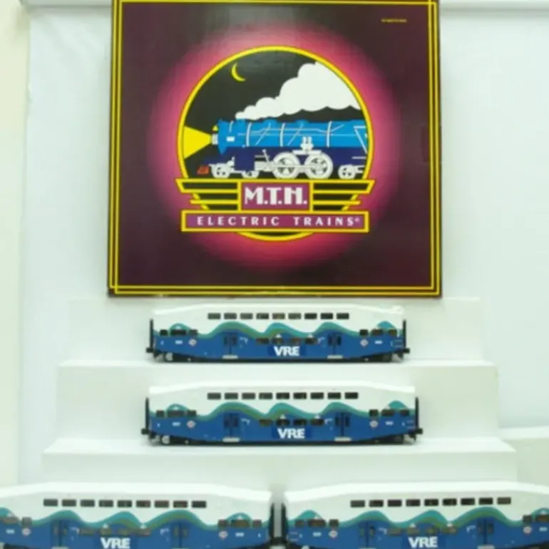 This is an MTH 20-65053 VRE 4-Car Bombardier Passenger Set. Included are Car nos. Cab Car 101 and Coaches 301, 303 & 308. Features include Durable ABS Intricately Detailed Bodies, Metal Wheels and Axles, Overhead Interior Lighting, Die-Cast 4-Wheel Trucks, Operating Die-Cast Metal Couplers, Colorful, Attractive Paint Schemes, End-of-Car Diaphragms, and Separate Metal Handrails.
