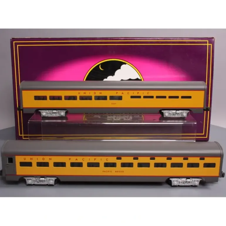 Here is a nice MTH 20-6510 O Gauge Union Pacific 70′ Aluminum Sleeper/Diner Passenger Car Set. This set features die-cast operating couplers on each car, silhouette window strips, fast angle wheel sets, interior lights, needle point axles and bearings. Each car measures 15 inches in length.