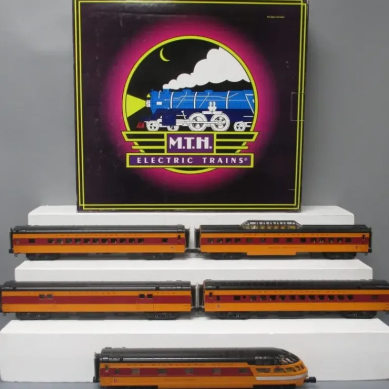 Here is a MTH 20-65112 Milwaukee Road 5-Car 70′ ABS Passenger Set (Smooth). This item displays a plastic body and metal wheels.