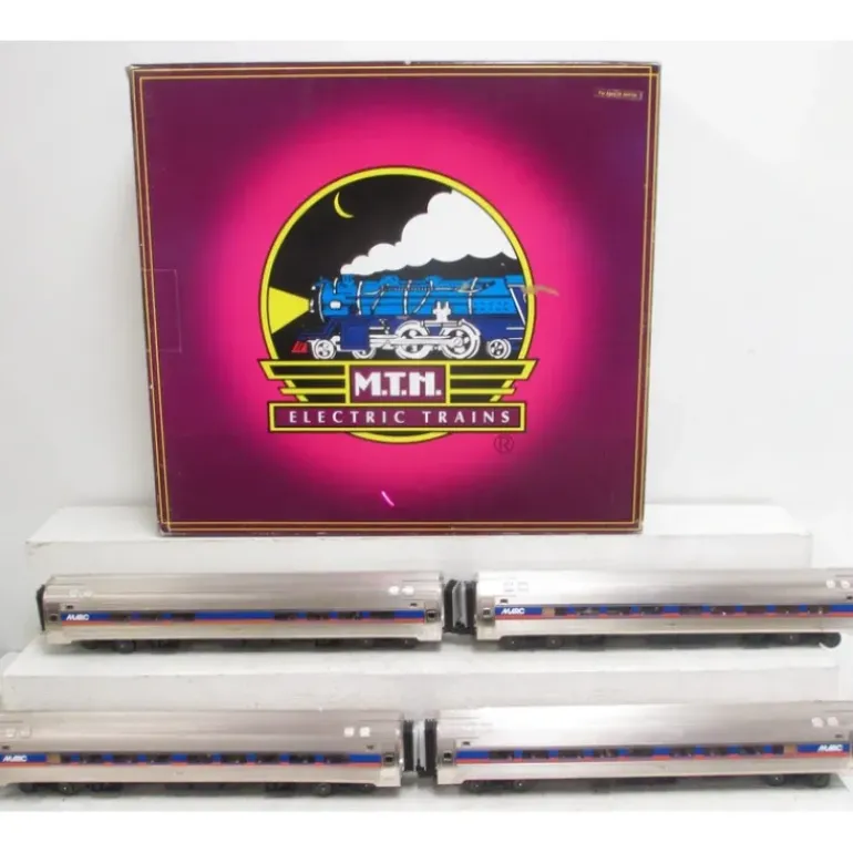 Here is an MTH 20-65141 MARC 4-Car Amfleet Passenger Set. Features for this set include: durable ABS intricately detailed bodies, metal wheels, metal axles, overhead interior lighting, die-cast 4-wheel trucks, operating die-cast metal couplers, colorful, attractive paint schemes, end of car diaphragms, separate metal handrails, fast angle wheelsets, needle point axles, detailed car interiors, detailed car undercarriage, and it operates on O-42 curves.
