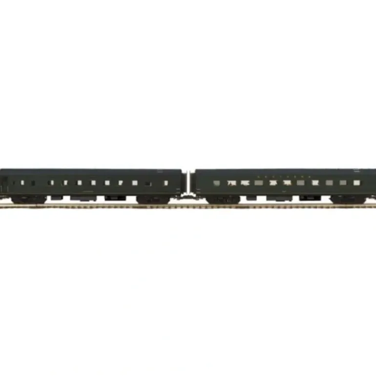 Here is an MTH 20-66149 Southern 2-Car 70′ ABS Sleeper/Diner Smooth-Side Passenger Set. Features for this set include: durable ABS intricately detailed bodies, metal wheels, metal axles, overhead interior lighting, die-cast 4-wheel trucks, operating die-cast metal couplers, colorful, attractive paint schemes, end of car diaphragms, separate metal handrails, fast angle wheelsets, needle point axles, detailed car interiors, detailed car undercarriage, and it operates on O-42 curves.