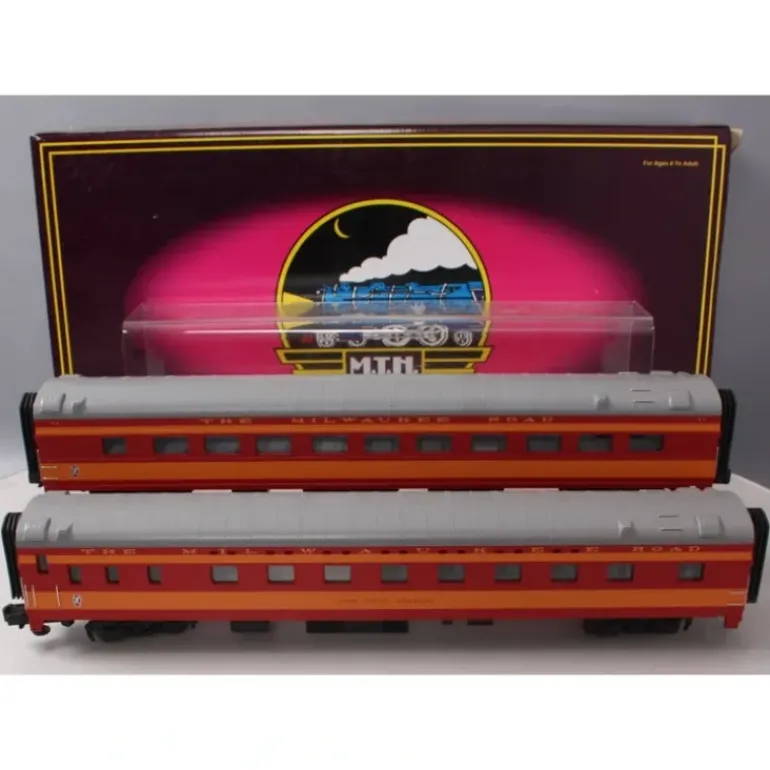 Here is an MTH 20-6652 Premier Milwaukee Road 2-Car 70′ ABS Smooth Side Sleeper & Diner Set from 2000. These cars feature illuminated furnished interiors, clear windows, die-cast trucks with operating metal couplers, and are 18 inches long.