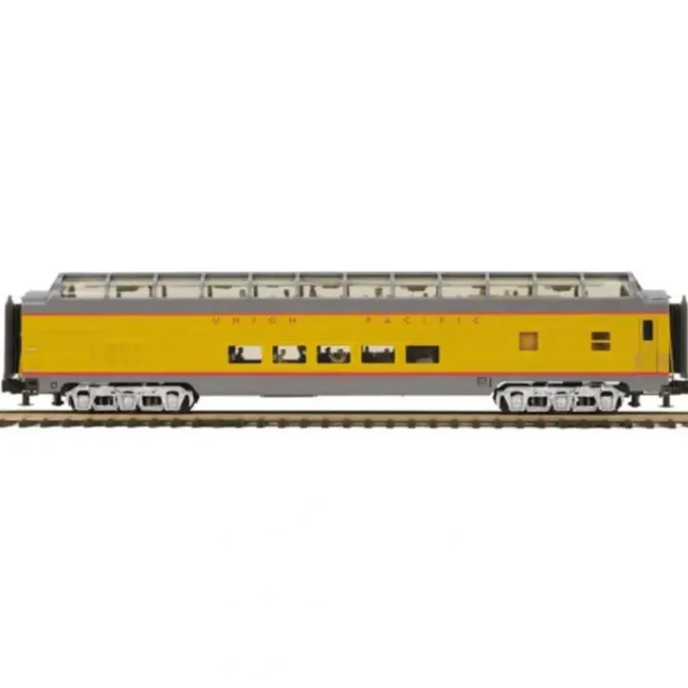 Here is an MTH 20-67148 Union Pacific 70′ ABS Full Length Vista Dome Passenger Car (Smooth). Features include overhead interior lighting, die-cast 6-wheel trucks, operating metal couplers, detailed interior, metal wheels and axles. It measures approximately 19 inches long.