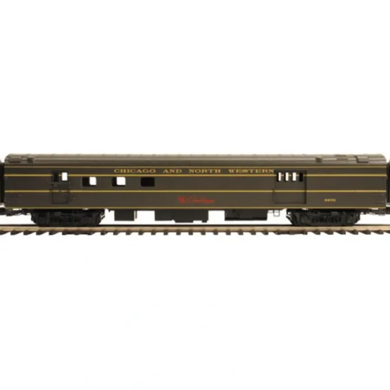 Here is a MTH 20-68129 Chicago Northwestern 70 ABS RPO Passenger Car (Smooth). This car features die-cast metal sprung trucks, metal wheels and axles, and operating knuckle couplers.