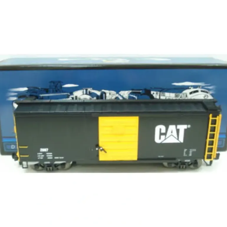 This is a MTH 20-80007F Caterpillar 40 Foot G Scale Boxcar. This boxcar features sliding doors, plastic sprung trucks, operating knuckle couplers, metal wheels and axles.