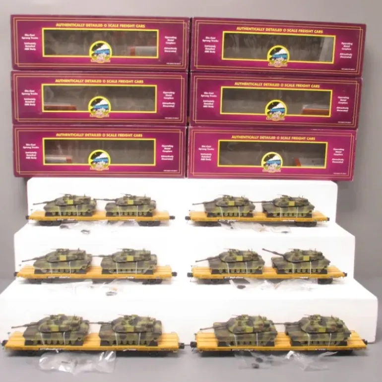 Here is a MTH 20-90361 O Gauge TTX 60′ Flat Cars w/Abrams M1a Tank Loads 6-Car Set. These cars features die-cast sprung trucks. Intricately detailed ABS body. Operating metal couplers. Attractively decorated.