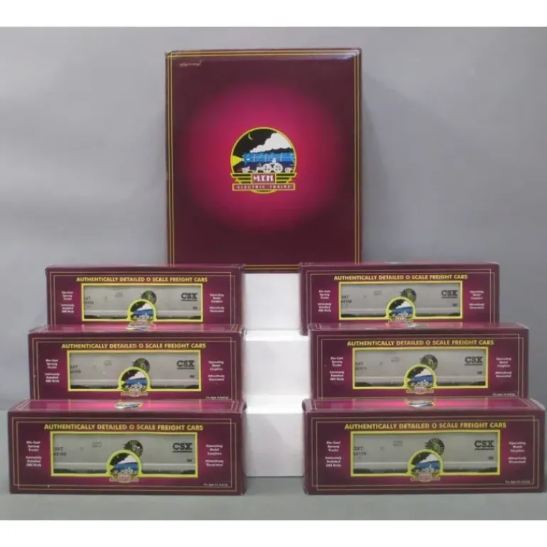 Here is an MTH 20-90438 CSX 6-Car 3-Bay Centerflow Hopper Car Set. This set features intricately detailed durable ABS bodies, metal wheels, metal axles, die-cast trucks, die-cast operating metal couplers, colorful and attractive paint schemes, fast angle wheelsets, needle point axles and 1:48 scale dimensions.