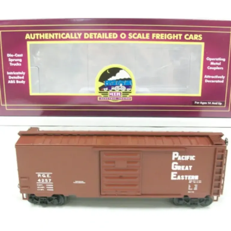 Here is an MTH 20-93452 Pacific Great Eastern 40′ Boxcar. This car features die-cast metal sprung trucks, die-cast metal operating knuckle couplers, and metal wheels and axles.
