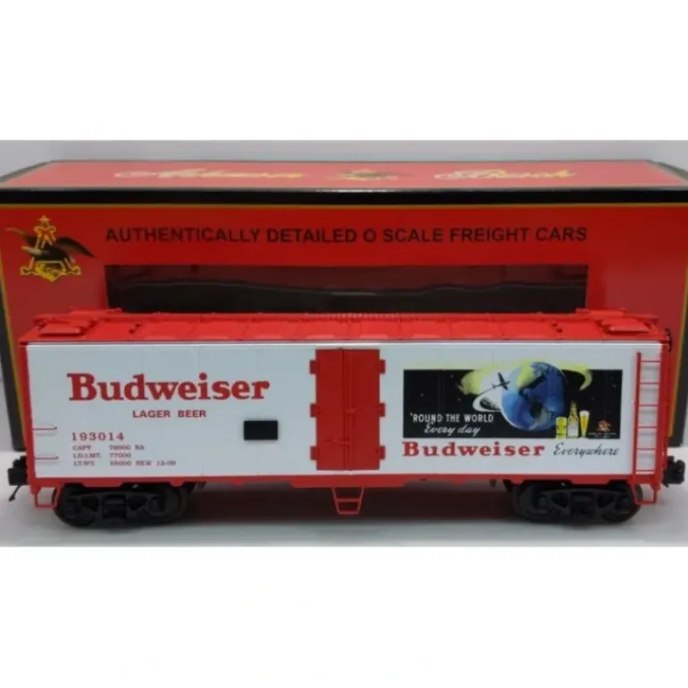 Here is an MTH 20-94216 Budweiser 40′ Steel Sided Reefer Car. It comes in two different road numbers: Car No.’s 193014, 193016. This car features die-cast metal sprung trucks, operating knuckle couplers, metal wheels and axles.