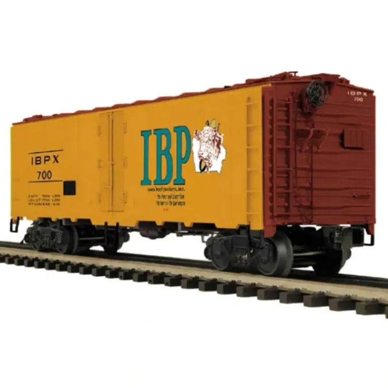 Here is an MTH 20-94219 Iowa Beef Packers 40′ Steel Sided Reefer Car. This car features die-cast metal trucks and operating metal couplers.