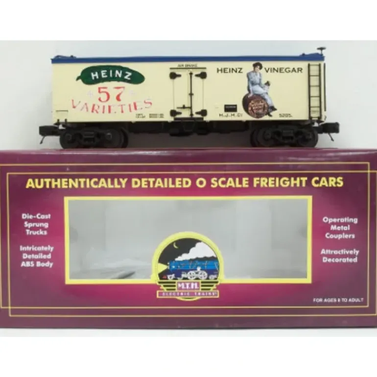 Here is an MTH 20-94329 Heinz 36-Foot Woodsided Reefer Car. This car features die-cast metal sprung trucks, operating knuckle couplers, metal wheels and axles.