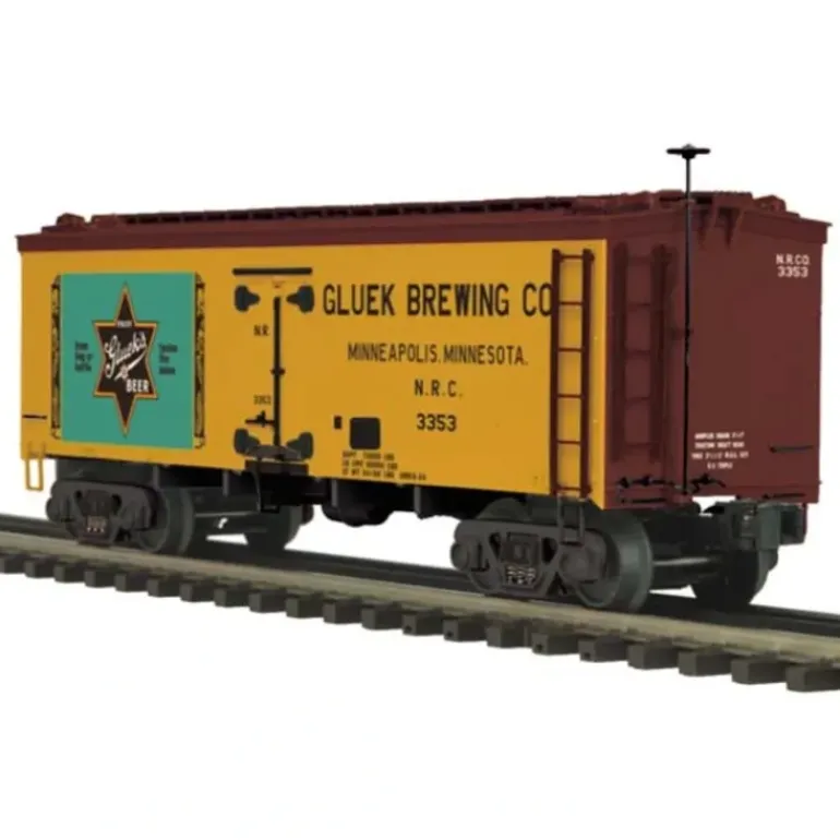 Here is an MTH 20-94355 Gluek Brewing Company 36′ Woodsided Reefer Car. This car features die-cast metal sprung trucks, operating knuckle couplers, metal wheels and axles.