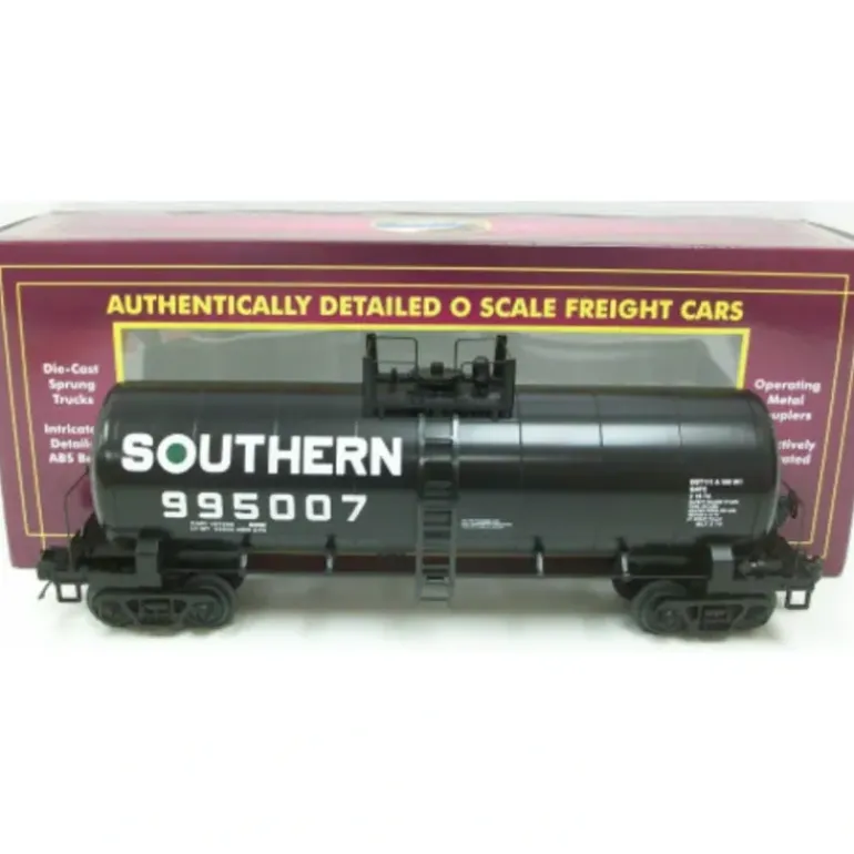 Here is a MTH 20-96184 O Southern Tank Car #995007. This car features die-cast metal sprung trucks, die-cast metal operating knuckle couplers, metal wheels and axles.