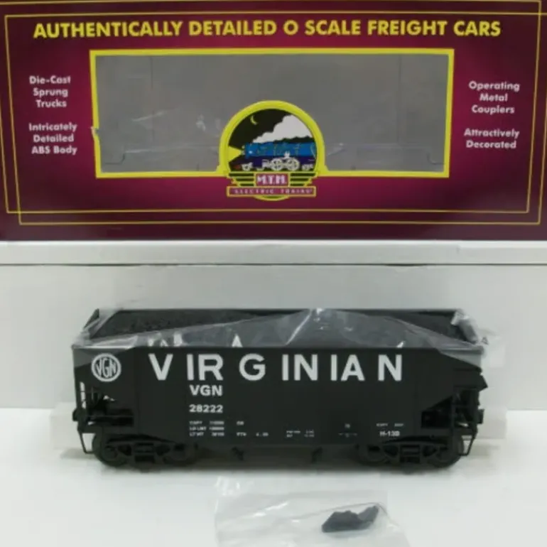 Here is MTH 20-97234 O Gauge Virginian 2-Bay Fish Belly Hopper #28222 w/Coal Load. This car features die-cast metal sprung trucks, die-cast metal operating knuckle couplers, and metal wheels and axles.