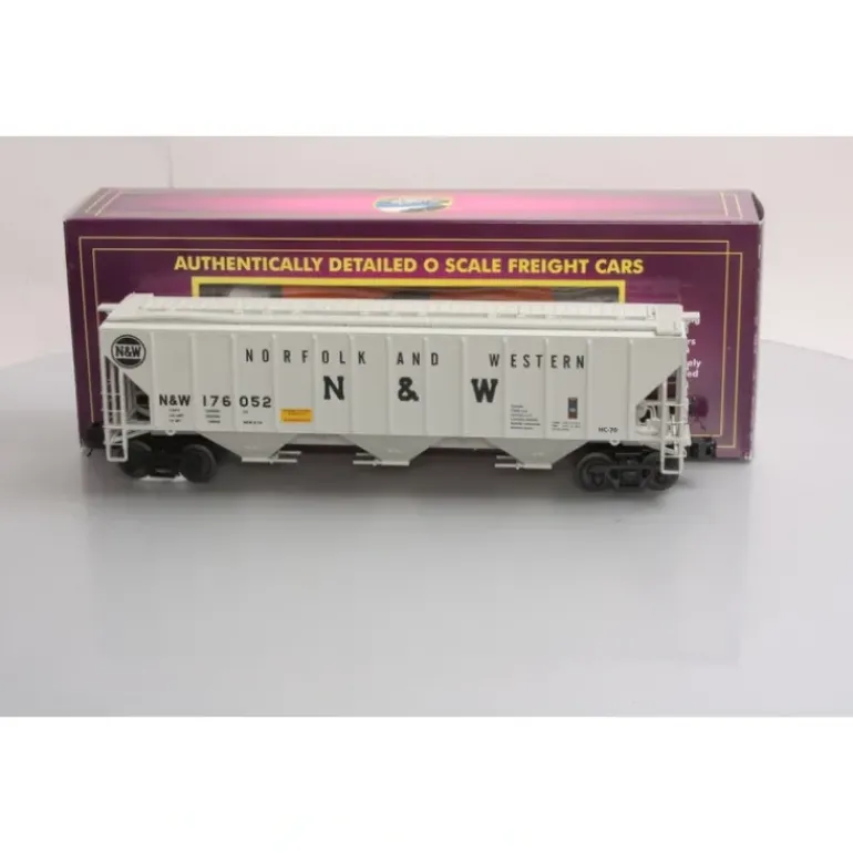 Here is an MTH 20-97255 Norfolk & Western Ps-2CD High-Sided Hopper Car. This car features die-cast metal sprung trucks, operating knuckle couplers, metal wheels and axles.