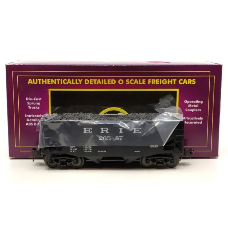 Here is a MTH 20-97267 2-BAY FISH BELLY HOPPER CAR ERIE. 2-Bay Fish Belly Hopper Car – Erie. Intricately Detailed Durable ABS Body. Metal Wheels and Axles. Die-Cast 4-Wheel Trucks. Operating Die-Cast Metal Couplers. Colorful, Attractive Paint Schemes. Fast-Angle Wheel Sets. Needle-Point Axles. 1:48 Scale Dimensions. O Scale Kadee Compatible Coupler Mounting Pads. Unit Measures:9 1/2 x 2 1/2 x 3. Operates On O-31 Curves.