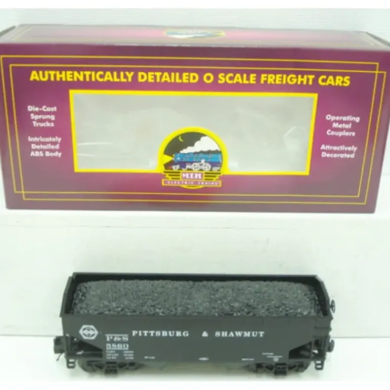 This is a MTH 20-97680 Pittsburg and Shawmut 2-Bay Offset Hopper with Coal Load #5860. Features include: intricately detailed ABS plastic body, operating metal knuckle couplers, attractively decorated, die-cast sprung trucks, and metal wheels.