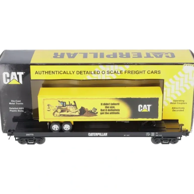This is an MTH 20-98563 Caterpillar Flat Car with Trailer. This flatcar features a removeable trailer, die-cast metal sprung trucks, die-cast metal operating knuckle couplers, metal wheels and axles.