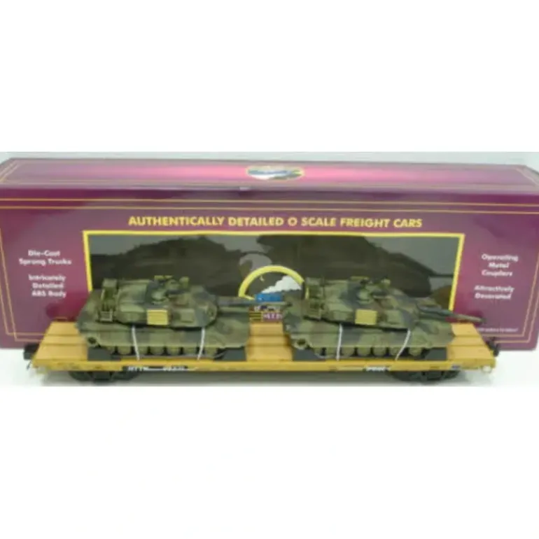 Here is an MTH 20-98580 60 Foot Flatcar with 2 M1A Abrams Tanks from 2007. ///These cars are really awesome! Features include intricately dtailed durable ABS body, metal wheels and axles, die-cast 4-wheel trucks, operating die-cast metal couplers, colorful, attractive paint schemes, fast-angle wheel set, needle-point axles and it measures 14 1/2 inches x 2 1/2 inches x 4 1/2 inches.