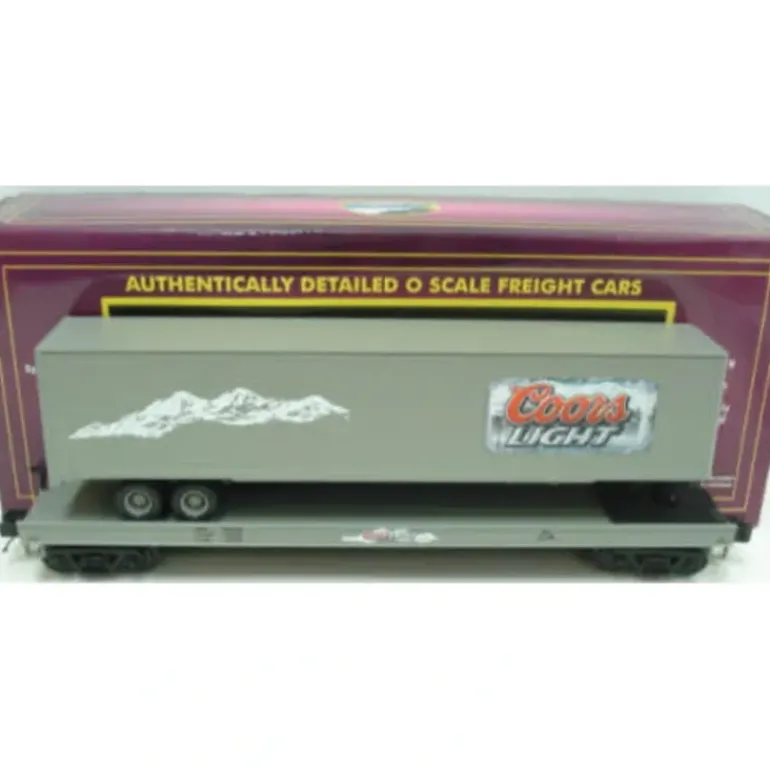 This is aMTH 20-98605 O Gauge Coors Light Flatcar w/48′ Trailer from 2007. Features inlcude an intricately detailed durable ABS body, metal wheels and ax, die-cast 4-wheel trucks, operating die-cast metal couplers, colorful, attractive paint schemes, fast-angle wheel sets, needle-point axles and it measures 14 1/2 inches x 2 1/2 inches x 4 1/2 inches. The minimum curve radius is O-31.