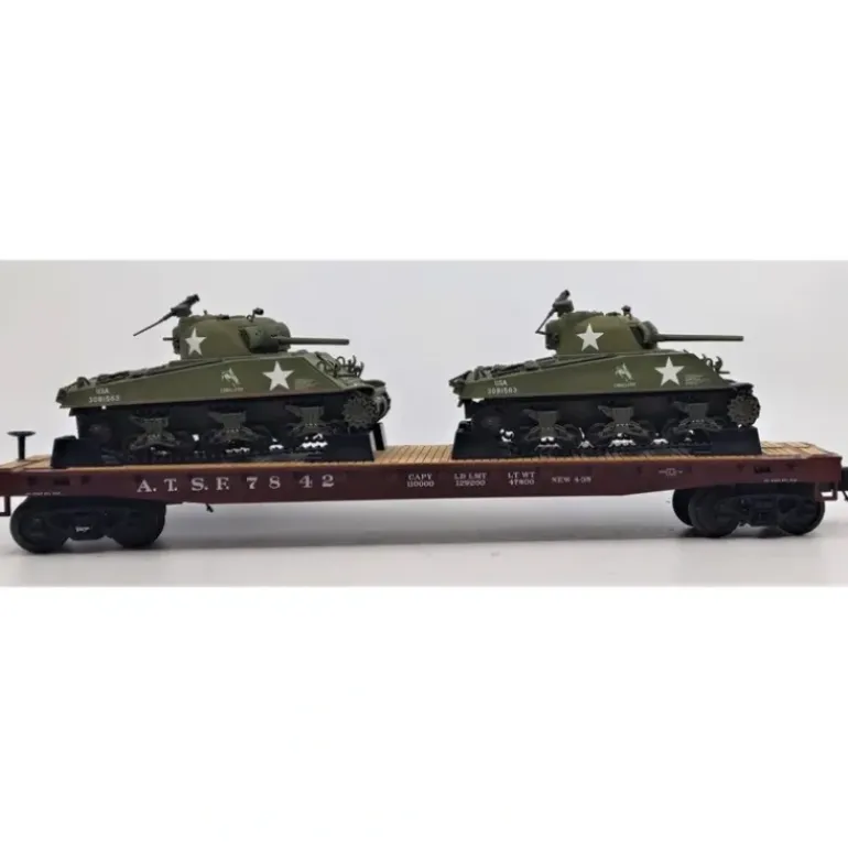 Here is a MTH 20-98639 Santa Fe Flat Car with Sherman Tanks.