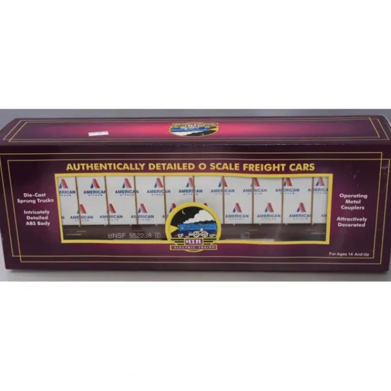 Here is a MTH 20-98659 BNSF Flat Car w/Bulkheads w/Covered Wood Load. This flat car features: Intricately Detailed Durable ABS Body Metal Wheels and Axles Die-Cast 4-Wheel Trucks Operating Die-Cast Metal Couplers Colorful, Attractive Paint Schemes Fast-Angle Wheel Sets Needle-Point Axles Removeable Covered Wood Load 1:48 Scale Dimensions Unit Measures:14 5/8″ x 2 3/4″ x 4″ Operates On O-31 Curves