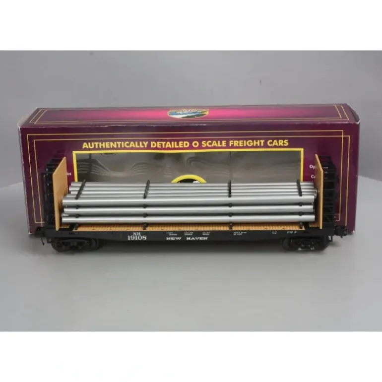 Here is a MTH 20-98665 New Haven Flat Car – w/Bulkheads & Pipe Load. This flat car features: Intricately Detailed Durable ABS Body Metal Wheels and Axles Die-Cast 4-Wheel Trucks Operating Die-Cast Metal Couplers Colorful, Attractive Paint Schemes Fast-Angle Wheel Sets Needle-Point Axles Removeable Pipe Load 1:48 Scale Dimensions Unit Measures:14 5/8″ x 2 3/4″ x 4″ Operates On O-31 Curves