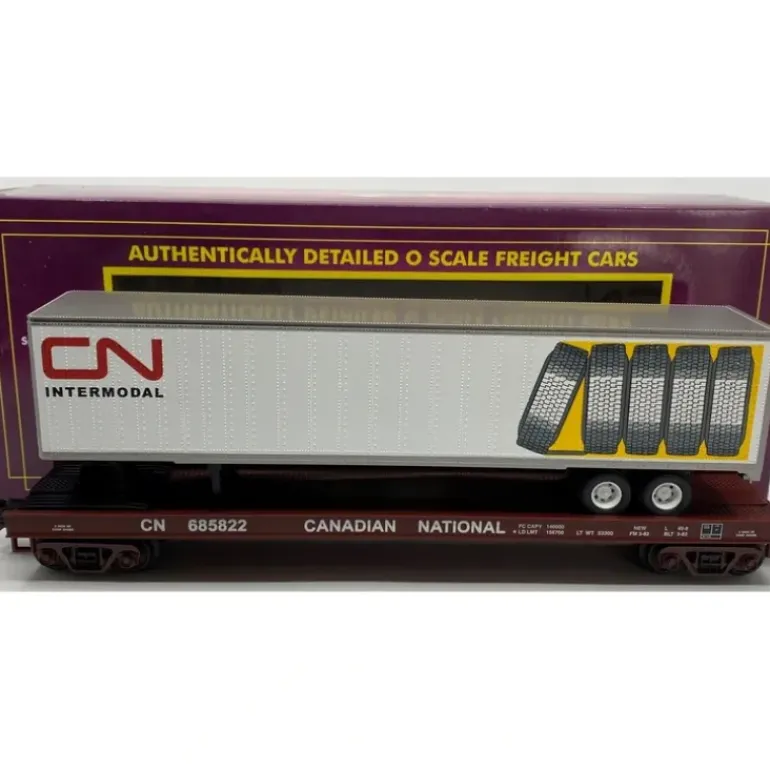This is an MTH 20-98679 Canadian National Flat Car with 48 Foot Trailer, #685829. It features die-cast sprung metal trucks, an intricately detailed ABS plastic body, metal wheels, metal axles, attractive decoration and operating metal knuckle couplers.