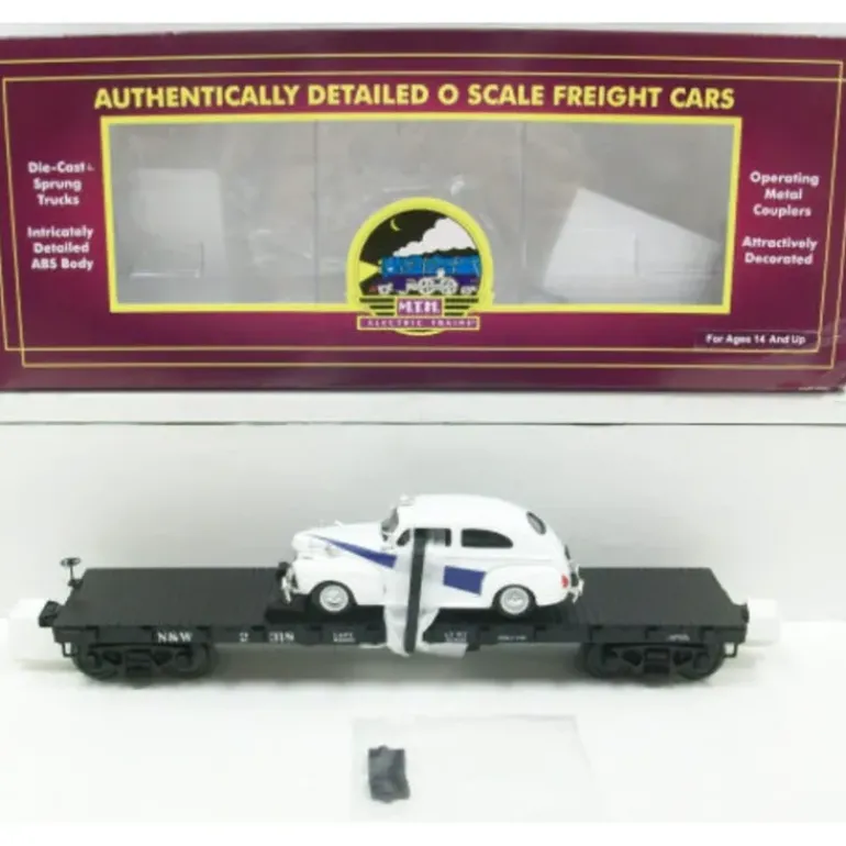 Here is an MTH 20-98685 Norfolk and Western 50 Ton 41 Ft. Wood Flat Car with 1941 Ford. This car features die-cast metal sprung trucks, die-cast metal operating knuckle couplers, and metal wheels and axles.