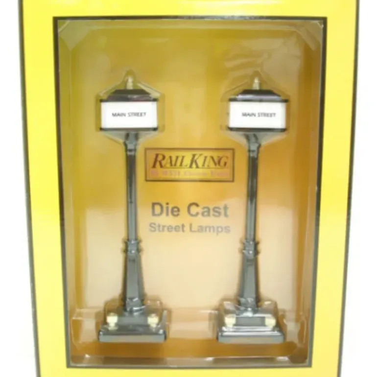 This is an MTH 30-11079 #57 Black Broadway/Main Street Lights. This includes 2 black lighed street lamp posts. Each one measures approixmately 7-1/2 inches tall and has a bright, baked enamel finish, with 18 volt screw base bulbs. These lamps can be powered with either AC or DC.
