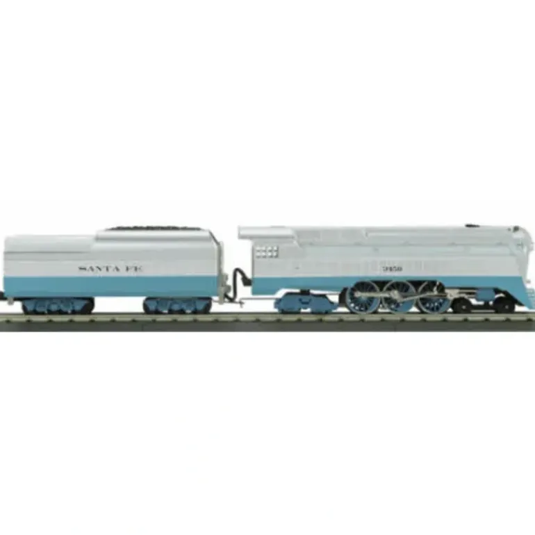 This is an MTH 30-1414-1 Santa Fe 4-6-4 Streamlined Hudson Steam Engine w/Proto-Sound 2.0. While the C&O’s “Yellowbelly” Hudsons were not the most numerous, most famous, or even the most beautiful streamlined Hudsons, they arguably got the last laugh. Chesapeake & Ohio Yellowbelly No. 490 is the only surviving Hudson from the golden age of Art Deco streamlined steam engines, and resides comfortably today at the Baltimore & Ohio Railroad Museum in Baltimore, Maryland. The C&O’s four L1 Hudsons started life in 1926 as ALCO-built Pacifics. In 1946-47 the railroad’s Huntington shops used their boilers and fireboxes to build streamlined steamers to haul connecting sections of The Chessie, the C&O’s new daytime domeliner planned for the Washington to Cincinnati route. The Hudsons’ tenders were shaped to blend in with the new Budd streamliners, and the steamers’ orange and fluted stainless steel finish matched the sides and letterboards of the new train. Unfortunately, by the time Budd delivered the 46 spectacular Chessie cars in 1948, the railroad’s fortunes had turned. The Chessie was quietly canceled without ever turning a wheel, and its cars scattered to other railroads and lesser C&O assignments. The streamlined Hudsons were repainted in yellow, acquired the nickname “Yellowbellies” from their crews, and assigned to other passenger trains. By 1950 three of the engines were out of service, but No. 490 soldiered on until Saturday, June 7, 1953, when it led a National Railway Historical Society excursion to Charlottesville, Va. that turned out to be the last C&O steam run into or out of Washington, D.C. Preserved in the Chesapeake and Ohio Historical Collection, No. 490 came to the B&O Museum in 1971. Returning to the M.T.H. RailKing lineup for the first time since 2000, the C&O Yellowbelly for 2006 comes fully equipped with Proto-Sound 2.0, including synchronized puffing smoke timed to four chuffs and puffs per driver revolution – a standard M.T.H. feature for the past six years. Available in authentic Chesapeake & Ohio livery, the model will also be produced in three other schemes for the Santa Fe, Southern, and Chicago, Burlington & Quincy. Features include Die-Cast Metal Chassis, Metal Wheels and Axles, Precision Flywheel Equipped Motor, Metal Handrails, Operating Marker Lights, Die-Cast Boiler and Tender Body, Constant Voltage Headlight, Die-Cast Truck Sides, Colorful Paint Scheme, Remote Controlled Proto-Coupler, Synchronized Puffing ProtoSmoke System, Locomotive Speed Control, Engineer Cab Figure, Proto-Sound 2.0 With The Digital Command System Featuring: Passenger Station Proto-Effects, Unit Measures:20 3/4 x 2 1/2 x 3 5/8, and it Operates On O-31 Curves.