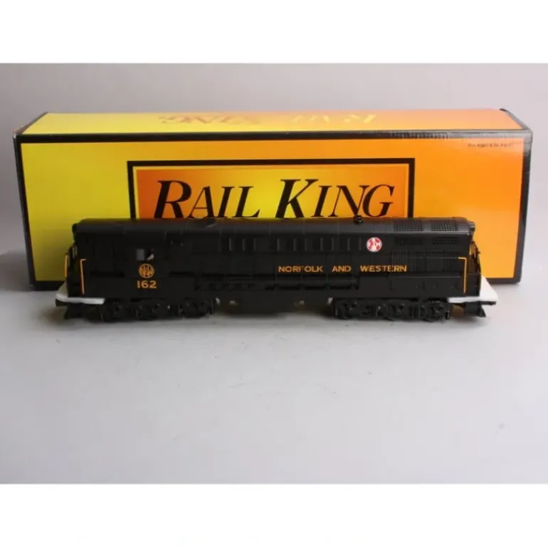 This is an MTH 30-2620-1 Norfolk and Western FM Trainmaster Diesel Engine – With Proto-Sound 2.0, Cab No. 162. Fairbanks Morse got into the locomotive business because it made submarine engines. FM’s unique opposed-piston diesel engine powered about half the U.S. Navy’s World War II submarine fleet and developed a great reputation for reliability; the adaptation to railroad equipment during and after the war seemed like a natural transition. In the opposed-piston motor, each cylinder had a piston at either end and the combustion chamber in the middle. There were no valves or cylinder heads. Intake and exhaust occurred through holes in the cylinder walls. The upper and lower banks of pistons each powered a separate crankshaft, and the two crankshafts were linked together to power the locomotive. While this sounds like a complex way to build an engine, the O.P. diesel in fact had several advantages over a conventional motor: less moving parts, terrific acceleration, and about double the horsepower per cylinder. In 1953 the O.P. engine reached its zenith in the Train Master. Introduced at the Railroad Manufacturers’ Supply Association show that year, FM’s new locomotive took the show by storm. It was the most powerful single-motored diesel locomotive of its era and had a brawny body to match its bold name. Emblazoned in bright yellow and red, four Train Master demonstrators barnstormed the country and walked away with any consist the railroads threw at them. For one brief moment, Fairbanks Morse looked like a contender. Ultimately, however, the opposed-piston engine proved ill-suited to locomotive use. The bone-jarring railroad environment was much rougher on the motor than a submarine cushioned by an ocean. The top crankshaft proved prone to oil leakage. Perhaps most important, maintenance was a nightmare. Whereas a single bad cylinder in an Electro-Motive diesel could be accessed by pulling off one cylinder head, a cylinder repair in an O.P. engine required removal of the top crankshaft and removal or disconnection of the entire top bank of cylinders – which also meant the roof of the locomotive had to come off. Ultimately, only 127 Train Masters were sold to 11 U.S. and Canadian railroads. In the world of O gauge railroading, however, the Train Master was a hit from the moment it hit the market in the mid-1950’s. The engine’s massive size and tremendous pulling power have made it one of the most-loved engines among 3-rail operators for nearly half a century. The Train Master returns to the RailKing Scale lineup in 2005 in the paint schemes of four of the original purchasers, complete with the digital sound, amazing slow speed capability, and variable smoke output that make Proto-Sound 2.0 the best sound and control system in O scale. Did You Know? The Trainmaster is officially designated the H-24-66 (Hood, 2,400 hp, 6 motors, 6 axles) Features include Directionally Controlled Headlights, Metal Wheels, Axles and Gears, Die-Cast Truck Sides, Pilots and Fuel Tank, Colorful Paint Scheme, Metal Chassis, Metal Handrails and Decorative Horn, and (2) Precision Flywheel