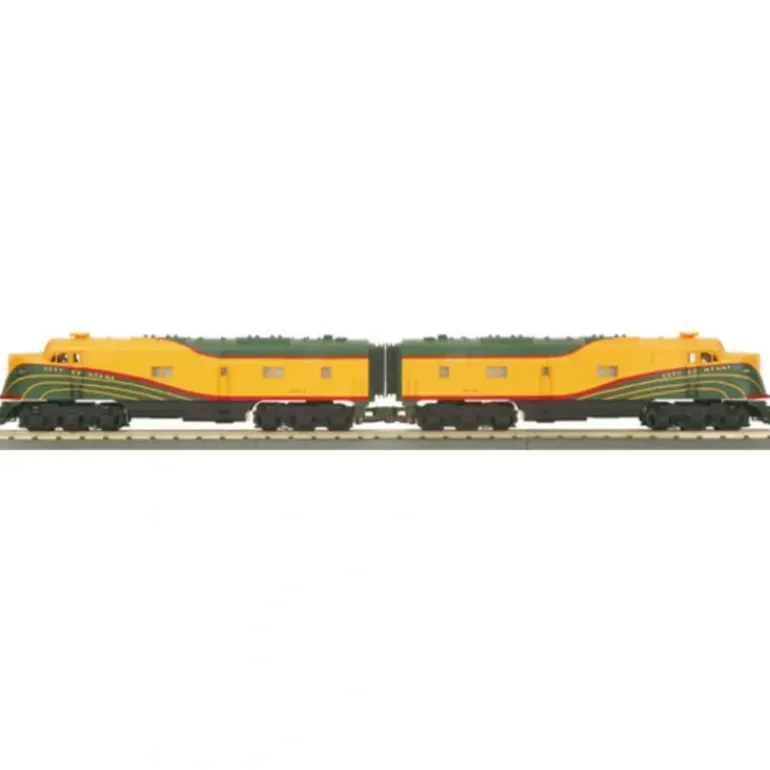 Here is an MTH 30-2833-1 Illinois Central E-6 AA Diesel Engine Set w/Proto-Sound 2.0. This locomotive features directionally controlled headlights, metal wheels, metal axles, die-cast trucksides, die-cast pilots, die-cast fuel tank, two remotely controlled ProtoCouplers, a colorful paint scheme, a metal chassis, metal handrails, a decorative horn, two precision flywheel equipped motors, an intricately detailed ABS body, two cab figures, locomotive speed control in scale MPH increments, operating smoke unit, illuminated number boards, ProtoSound 2.0 with the Digital Command System featuring Freight Yard ProtoEffects, and it operates on O-31 curves.