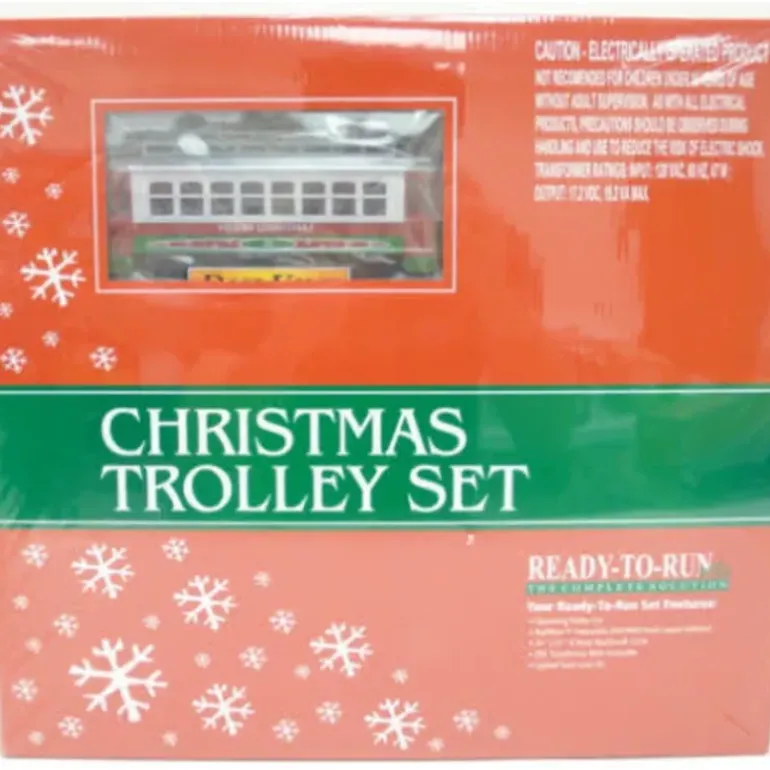 This is an MTH 30-4172-1 Christmas Trolley Ready To Run Train Set. This set features an operating trolley car, RailWare Interactive DVD with track layout software, 31 inch x 31 inch 8-piece RealTrax oval, ZDC transformer with controller, and lighted track lock-on. The trolley features detailed ABS body, powerful motor, automatic reversing bumpers, operating headlight, moveable power pole, lighted interior, all-metal wheels and gears, and it measures 8 1/4 inches long.