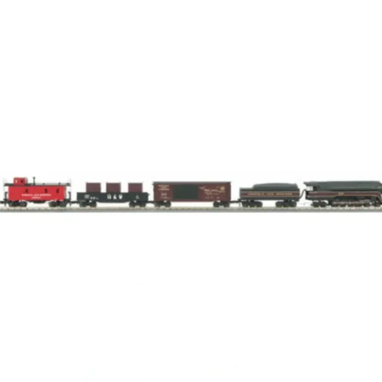 This is an MTH 30-4184-1 Norfolk and Western 4-8-4 Bantam J Steam Passenger R-T-R Train Set w/Proto-Sound 2.0. This Set Includes: 4-8-4 J Steam Engine (30-004e), RK 40′ Double Door Box Car (30-004b), RR Gondola w/LCL Containers (30-004c), RR Offset Steel Caboose (30-004d), 12 Piece RealTrax Oval, 100 watt Power Supply With Controller, Lighted Track Lock-On, and a RailWare DVD Rom. Often called The Last Steam Railroad in America, the Norfolk & Western relied totally on steam power until well into the 1950s, when most other railroads had already converted to diesels. The N&W’s loyalty to steam was prompted by two factors. The N&W was mainly a coal-hauling railroad with most of its trackage in Virginia, West Virginia, and Ohio, so fuel was abundant and cheap. Perhaps more important, the N&W built some of the best steam engines ever made, in its own shops in Roanoke, VA. Among the finest of these was the Class J, a streamlined greyhound that could cruise at well over 90 mph. One of these massive 4-8-4 Northerns survives today at the Virginia Museum of Transportation, not far from the shops where it was born. Recreate the Norfolk & Western’s daily conquest of the Appalachian Mountains with this rugged freight set. Headed by a powerful Class J Northern, this set features all-metal trucks and couplers, RealTrax that can be set up quickly on a carpet or floor, puffing smoke, and CD-quality sounds that include freight yard sound effects and the Class J’s beautiful whistle, bell, and deep chuff. The Set Features, Die-Cast Steam Locomotive, 3-Car Freight Consist, 31 x 51 12-Piece RealTrax Circle, RailWare Interactive DVD With Track Layout Software, Lighted Track Lock-On, and Z-1000T Transformer With Controller. The Locomotive Features Die-Cast Boiler and Chassis, Flywheel Equipped Motor, Locomotive Speed Control, Electronic Reverse Unit, Remotely Controlled Proto-CouplerT, Operating Headlight, Synchronized Puffing ProtoSmokeT Unit, All-Metal Wheels and Gears, and Proto-Soundr 2.0 Sound System Featuring Freight Yard Proto-EffectsT. The Feight Cars Feature Intricately Detailed Durable ABS Bodies, Durable Die-Cast 4-Wheel Trucks With Smooth-Rolling Metal Wheels and Axles, Operating Die-Cast Metal Couplers, Colorful, Attractive Paint Schemes, Sliding Car Doors, and the Freight Car Measure: 10 3/4 x 2 3/8 x 3 1/8.