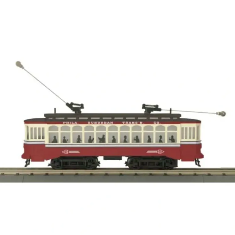 Here is an MTH 30-5108-1 Philadelphia Suburban Transportation Company Brill Semi-Convertible Trolley w/PS2. This trolley features directionally controlled headlights, intricately detailed ABS body, metal wheels, metal axles, metal gears, moveable pantograph pole, die-cast trucksides and pilots, colorful paint scheme, precision flywheel equipped motor, locomotive speed control in scale MPH increments, lighted cab interior, illuminated number boards, ProtoSound 2.0 with the Digital Command System featuring Station Stop ProtoEffects.
