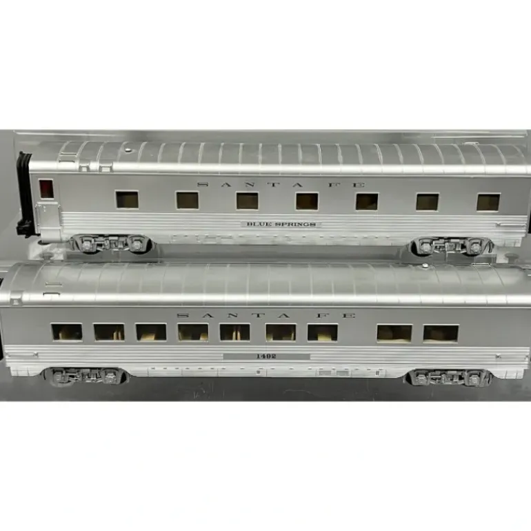 Here is a MTH 30-67175 O Gauge Santa Fe RailKing 2-Car 60′ Streamlined Sleeper/Diner. Features include durable ABS intricately detailed bodies, metal wheels and axles, overhead interior lighting, die-cast 4-wheel trucks, operating die-cast metal couplers, colorful, attractive paint schemes, end-of-car diaphragms, fast-angle wheel sets, needle-point axles, detailed car interiors, 2-car sets feature [1] sleeper, and [1] diner. Unit Measures: 34 6/16″ x 2 5/8″ x 3 5/16″. Operates On O-31 Curves.