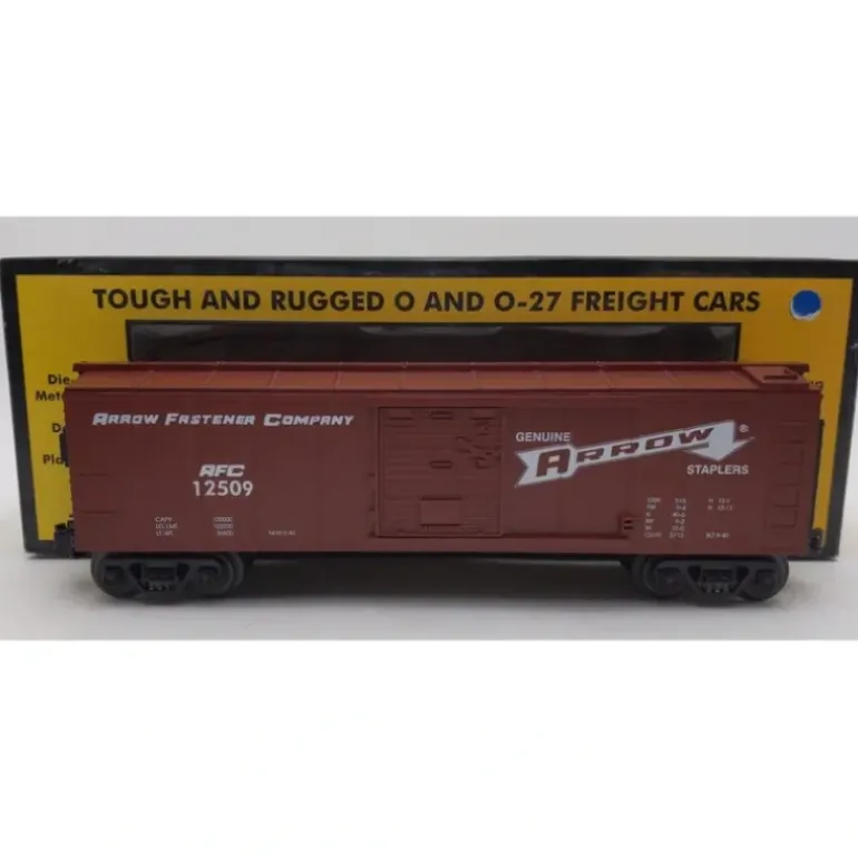 This is an MTH 30-7422 Arrow Stapler Boxcar from 1998. This boxcar features sliding doors, die-cast metal sprung trucks, die-cast metal operating knuckle couplers and metal wheels and axles.