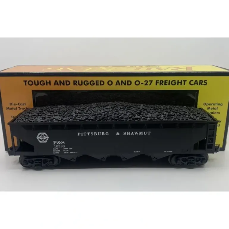 Here is an MTH 30-75285 Pittsburg & Shawmut 4-Bay Hopper Car. It features an intricately detailed and durable ABS body, die-cast trucks, metal wheels, and operating die-cast knuckle couplers.