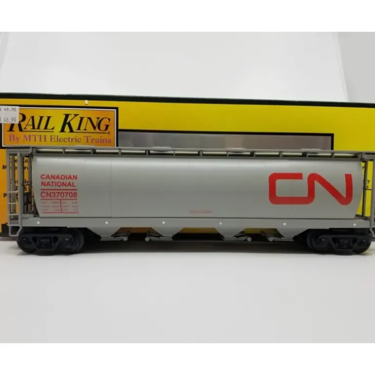 Here is a MTH 30-75363 O Gauge Canadian National 4-Bay Cylindrical Hopper Car #370708. This car features: an Intricately Detailed Durable ABS Body, Metal Wheels and Axles, Die-Cast 4-Wheel Trucks, Operating Die-Cast Metal Couplers, Colorful, Attractive Paint Schemes, Fast-Angle Wheel Sets, Needle-Point Axles, 1:48 Scale Dimensions, O Scale Kadee Compatible Coupler Mounting Pads, Unit Measures:13 3/8″ x 2 3/8″ x 3 7/16″, and it Operates On O-31 Curves.