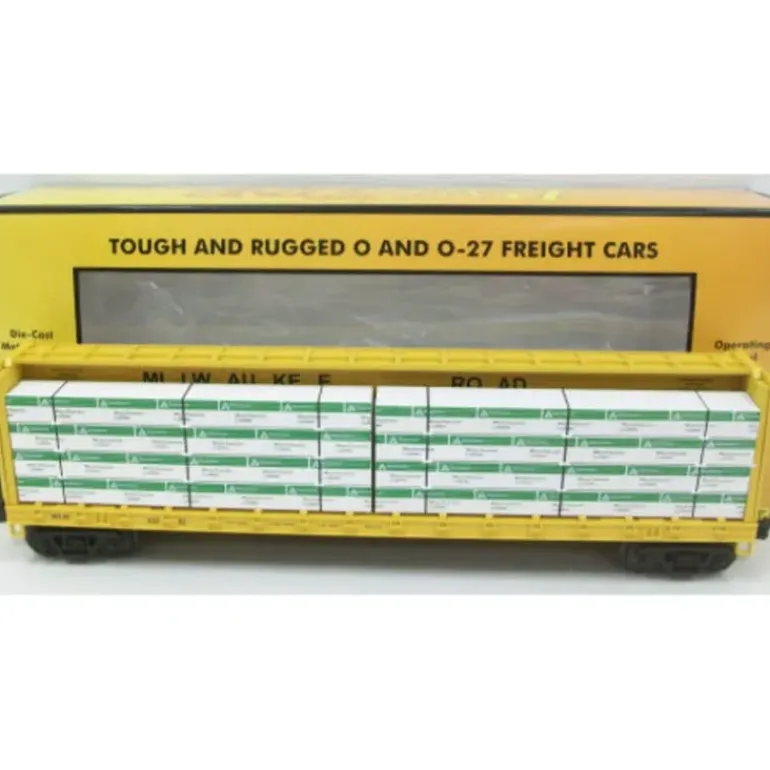 Here is an MTH 30-76325 Milwaukee Road Center I-Beam Flatcar. This car features die-cast metal sprung trucks, die-cast metal operating knuckle couplers, and metal wheels and axles.