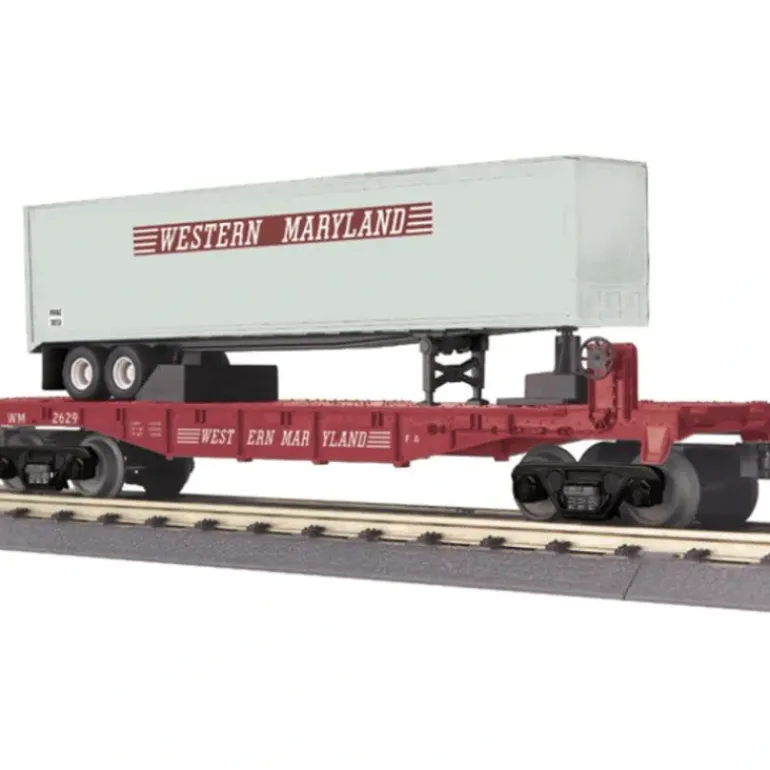 This is an MTH 30-76336 O Western Maryland Flat Car w/ Trailer. High quality, traditionally sized RailKing Freight Cars provide detailed bodies and colorful paint schemes for the O Gauge railroader. MTH makes an enormous variety of RailKing Freight Cars, including many different car types and road names. No matter what era or part of the country you are modeling, RailKing is sure to have something for you. Features Include: Intricately Detailed Durable ABS Body, Metal Wheels and Axles,Die-Cast 4-Wheel Trucks, Operating Die-Cast Metal Couplers, Colorful, Attractive Paint Schemes, Decorative ,Brake Wheels, Fast-Angle Wheel Sets, Needle-Point Axles, ABS Detailed Trailer, Unit Measures:11 5/8 x 2 1/4 x 3 3/4,Operates On O-27 Curves.