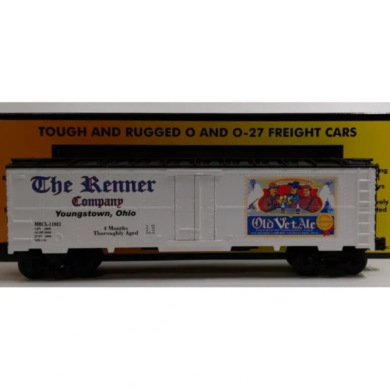 Here is a MTH 30-78049 O Gauge Old Vet Ale Modern Reefer Car #11083. It features an intricately detailed and durable ABS body, die-cast trucks, metal wheels, and operating die-cast knuckle couplers.