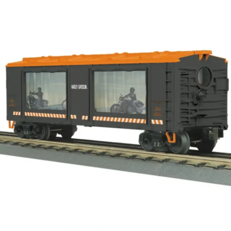 Here is an MTH 30-79227 Harley-Davidson Operating Action Car. This exciting car features a backlighted moving animation strip visible through each of the car’s four large viewing windows. Utilizing a quiet and efficient motorized player and bright LED lighting, the animated action really shines bright!