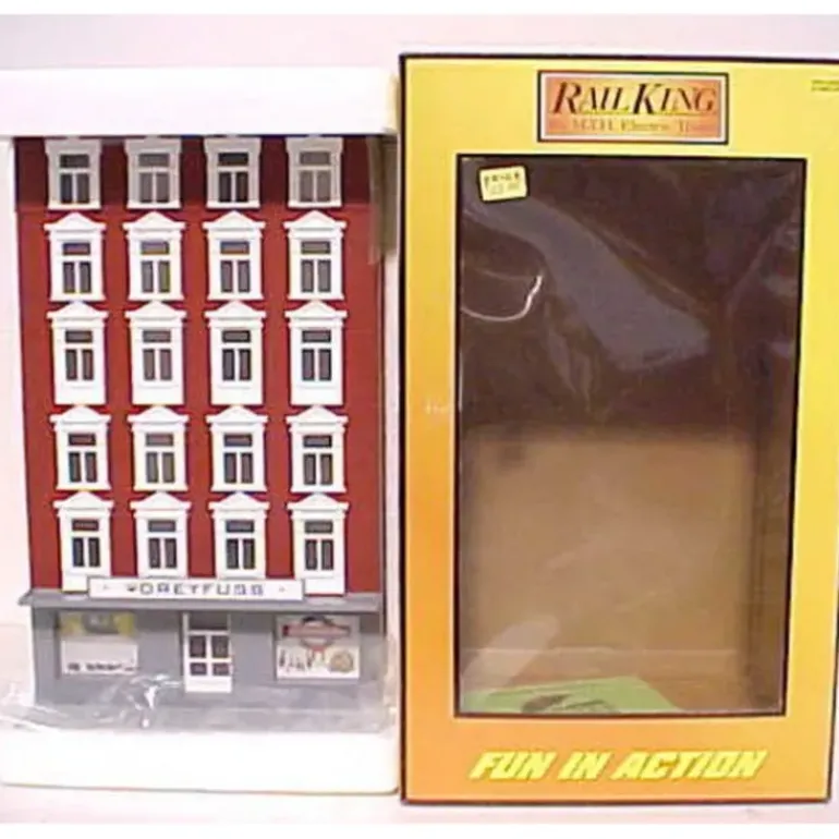 Here is an MTH 30-9077 O “The Dreyfuss” 6-Story Office Building. It comes preassembled with a rooftop billboard, frosted windows, and interior illumination. It measures approximately 16 inches tall and has a base footprint of 9 inches by 9 inches.