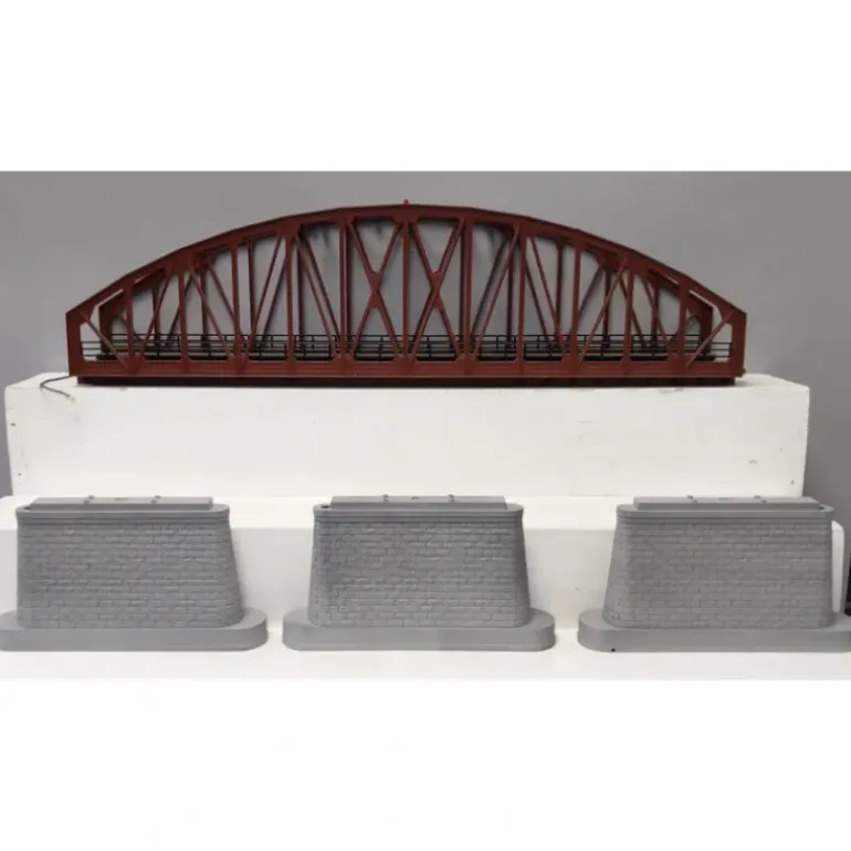 Here is an MTH 40-1103 O Scale Steel Arch Bridge. Features -ABS construction -Blinking Light -Pre-wired Measures: Bridge – 30″ Additional Girder Sections – 10″