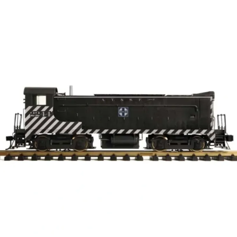 This is an MTH 70-2046-1 G Scale Santa Fe VO-1000 Diesel Engine w/ PS2 #2244. It features directionally controlled headlights, metal wheels, metal axles, metal gears, two remotely controlled Proto-Couplers, two precision flywheel equipped motors, locomotive speed control, two cab figures, lighted cab interior, illuminated number boards, lighted front marker lights, spinning roof fans, metal body side grilles, an operating smoke unit, and it operates on R-1 curves.